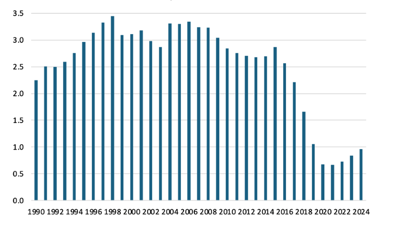 Produzione petrolifera del Venezuela (1990-2024, mil. b/g)