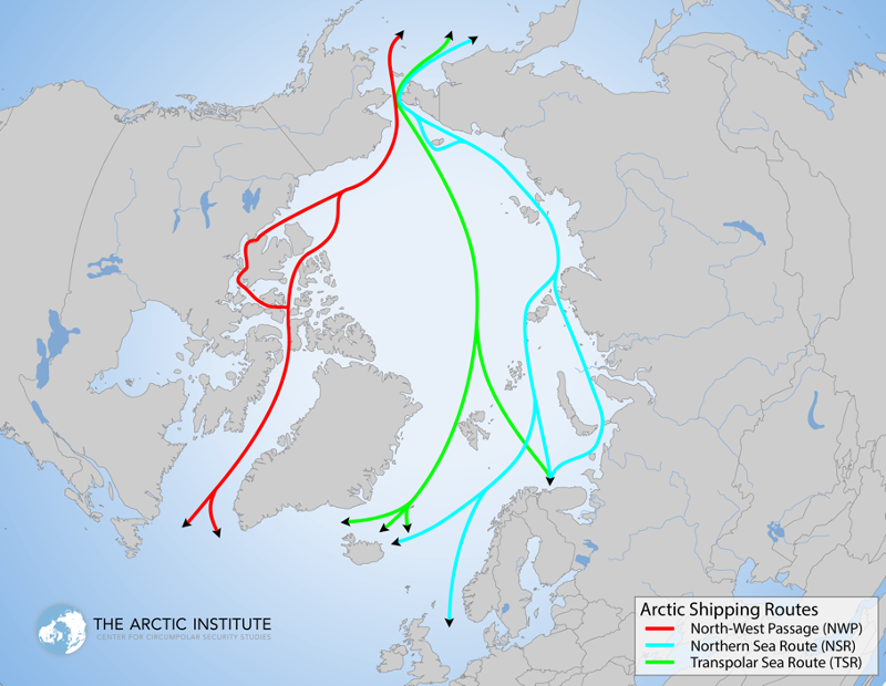 Mappa delle principali rotte marittime artiche: la rotta del Mare del Nord, il passaggio a Nord-Ovest e la rotta transpolare