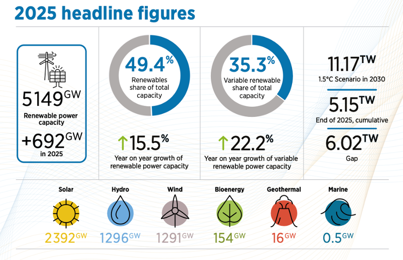 Così come emerge dal nostro ultimo report Renewable Capacity Statistics 2026, nel 2025 la capacità totale di energia rinnovabile ha raggiunto i 5.149 gigawatt (GW) grazie all’installazione di nuova capacità per 692 GW, pari a un incremento annuo del 15,5%. L'energia rinnovabile assorbe la quasi totalità della crescita della capacità totale con una quota dell'85,6%, sebbene quest’ultima risulti in calo rispetto al 92,0% del 2024. Diminuzione che si spiega in ragione di un aumento delle installazioni non rinnovabili, trainato principalmente dalla Cina, che ha aggiunto oltre 100 GW di capacità non rinnovabile, di cui circa l'81% proveniente dal carbone.
