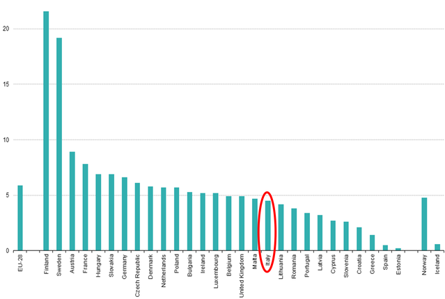 Fig. 1- Quote di consumi di biocarburante per trasporto: un confronto a livello europeo (valori in %, anno 2014).
