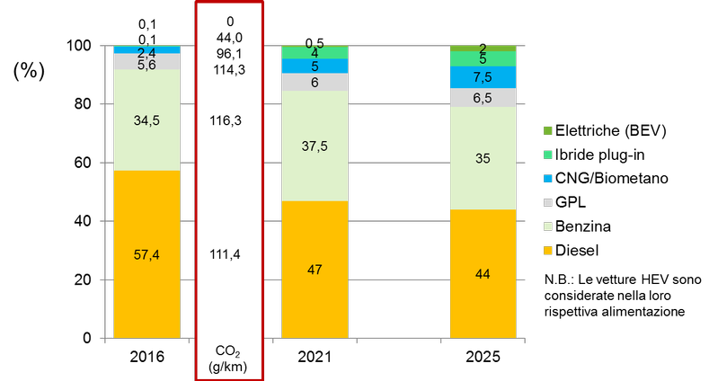 Le previsioni sul mercato delle nuove autovetture in Italia al 2021 e al 2025 indicano un ruolo crescente delle tecnologie alternative, come i combustibili gassosi (metano, GPL e biometano) e la tecnologia elettrica. Tuttavia, i carburanti convenzionali (diesel e benzina) continueranno ad avere un ruolo rilevante nel settore dei trasporti nei prossimi anni.