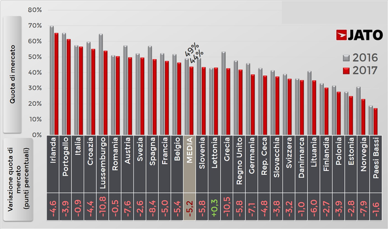 Lo scenario che emerge dai dati nazionali evidenzia come, seppure con differenze, la riduzione della quota di mercato sia un fattore comune tra i diversi paesi. Emerge, infatti, in 25 dei 26 mercati analizzati, con la Lettonia che fa eccezione, passando dal 42,9% del 2016 al 43,2% dell’anno seguente. Anche paesi come il Portogallo o l’Italia, dove il diesel ha tradizionalmente giocato un ruolo chiave, hanno registrato un declino tra il 2016 e il 2017. Per non parlare dei crolli osservati in Lussemburgo, Grecia e Spagna.