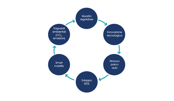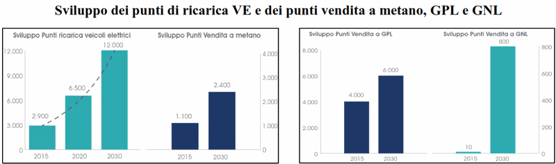 Un ruolo di indubbia importanza lo riveste infine l’avanzamento delle rinnovabili che, grazie al contributo dei biocarburanti e alla crescita dell’elettrico (dal 2% al 5%), arriveranno a coprire fino al 21% dei consumi assorbiti dal settore trasporti al 2030. Più in generale, lo sviluppo di carburanti alternativi inciderà al ribasso sulla domanda di quelli tradizionali, attraverso il progressivo aumento dell’utilizzo di veicoli elettrici, a metano, a GPL e GNL. Prodromica all’avanzamento di queste nuove energie e, più in generale, allo sviluppo della mobilità alternativa, è l’espansione delle infrastrutture di distribuzione, un processo già in atto e che vede un sostanziale aumento in futuro dei punti di ricarica elettrica e dei punti vendita a metano, insieme alle stazioni a GPL e GNL.