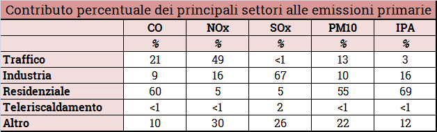 Dagli inventari delle emissioni nazionali si stima che oltre il 50% delle emissioni di PM10 siano prodotte dal riscaldamento e percentuali analoghe si riscontrano per il CO e gli IPA. Questo PM prodotto è ascrivibile in misura preponderante alle emissioni dei piccoli apparecchi alimentati a legna o pellet, in quanto i fattori di emissione associati a questi apparecchi sono decine, centinaia e in taluni casi migliaia di volte superiori rispetto a quelli relativi agli impianti alimentati con altri combustibili. In particolare le emissioni specifiche di PM legate alla combustione dei combustibili gassosi sono sostanzialmente nulle e quindi, benché proprio questi combustibili siano preponderanti nel riscaldamento civile, il loro contributo è trascurabile.