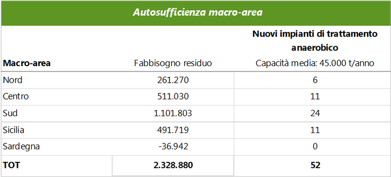 Su queste basi, per soddisfare il fabbisogno di trattamento residuo che avremo da qui ai prossimi 15 anni vi sarebbe necessità di avviare 52 nuovi impianti di digestione anaerobica (assumendo una capacità di trattamento di 45.000 tonnellate/anno), di cui 35 da realizzare nel Mezzogiorno e nelle Isole.
