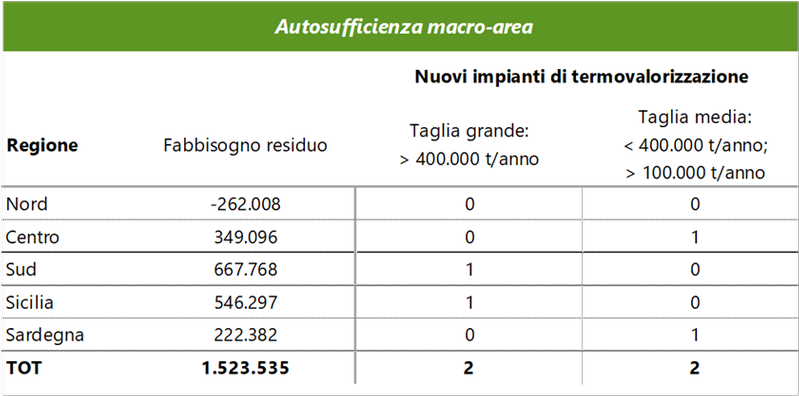 Se si mutua una declinazione del principio di autosufficienza su base geografica (Nord, Centro, Sud, Isole maggiori), da qui ai prossimi 15 anni occorrerebbe realizzare quattro nuovi impianti di termovalorizzazione, due di taglia grande, collocati in Sicilia e Campania, e due di taglia media, da avviare in Sardegna e nel Centro Italia, al servizio delle regioni Umbria, Marche e Lazio.