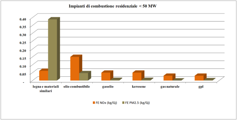 Di seguito si illustra il confronto tra i fattori di emissione relativi al riscaldamento (impianti di combustione residenziale con potenza inferiore a 50 MW) per anidride carbonica (CO2), ossidi di azoto (NOX) e materiale particolato (PM2.5).