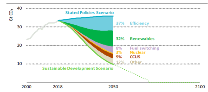 Questo il quadro delineato dall’AIE. Fosco nella descrizione dello sforzo richiesto, possibilista nell’indicazione delle vie percorribili: come mostra il grafico, è possibile ridurre le emissioni con un mix di strumenti, 2/3 dei quali sono rappresentati dall’espansione delle rinnovabili e dai miglioramenti di efficienza energetica. A questo punto, le reazioni possibili sono tre: dire che siamo su una traiettoria sbagliata che va invertita al più presto perché è possibile farlo; dire che non siamo in grado di farlo perché lo sforzo è al di là dell’umana capacità, soprattutto decisionale; dire che … l’AIE sbaglia. Ed è questo, più o meno, che è accaduto quest’anno. Una prima lettera critica era stata inviata all’Agenzia di Parigi ad aprile, una seconda a novembre, sottoscritta da 65 aziende, istituti, personalità tra i quali è possibile citare Allianz, Zurich Insurance Group, Orsted, e la ex Executive Secretary della UNFCCC Christiana Figueres. L’AIE è stata criticata essenzialmente per tre ragioni: per proporre uno scenario SDS (Sustainable Development Scenario) non sufficientemente aggressivo, in grado di contenere l’incremento di temperatura entro 1,5°C e condurre a emissioni nette pari a zero entro il 2050 (e non entro il 2070); per non dare sufficiente visibilità a tale scenario SDS che, secondo gli estensori della lettera, dovrebbe essere lo scenario centrale del WEO; perché, depotenziando lo scenario SDS - sia nel contenuto che nella visibilità - influenzerebbe negativamente gli investimenti in virtù dell’autorevolezza della sua voce, diffondendo una sorta di profezia che si auto avvera.
