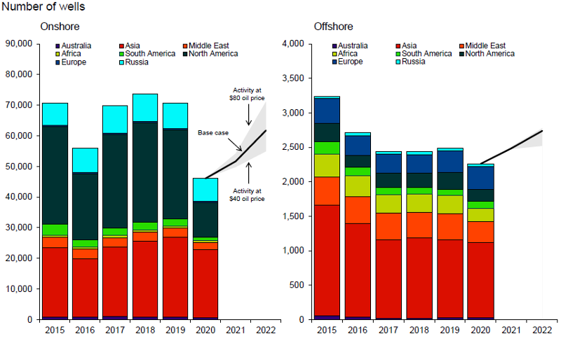 I servizi onshore sono più esposti a variazioni di prezzo nel breve termine: assumendo un prezzo fisso di 50 doll. al barile, 3.000 pozzi sarebbero a rischio nel 2021 e nel 2022. I pozzi a rischio diventerebbero 11.000, se il prezzo al barile salisse a 70 doll. Di questi, la maggior parte appartiene allo shale del Nord America, mentre circa un terzo proviene dall’Asia.