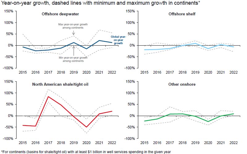 La Fig.3 rappresenta i tassi di crescita annuali della spesa per i servizi di pozzo. Per ogni tipologia di servizio, le linee indicano i tassi di crescita a livello globale, mentre le linee tratteggiate indicano i tassi di crescita minimi e massimi dei diversi continenti. In tutti i casi, vi è una ripresa a ‘V’, con una crescita nel 2021 a seguito del crollo del 2020. Si noti, inoltre, come, nonostante persistano evidenti differenze regionali, la crescita di spesa per i servizi offshore si stabilizzi nel 2022.