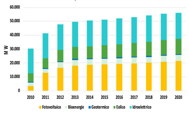 Il mercato delle rinnovabili è – a livello globale ed europeo – un mercato in grandissima espansione, con una crescita che non si è arrestata nemmeno nel corso del 2020, nonostante le problematiche connesse al diffondersi della pandemia da Covid-19. È un segno, inequivocabile, del fatto che la transizione energetica non sia solo un “piano”, ma una “realtà” che sta profondamente cambiando il mercato dell’energia. La marcia verso la completa decarbonizzazione, che l’Europa si è posta come obiettivo per il 2050, sembra quindi essere inesorabilmente avviata e sta evidentemente catalizzando l’interesse del mondo industriale e finanziario. Se l’Europa però ha “festeggiato” nel 2020, se così si può dire, ed ovviamente limitatamente al comparto delle rinnovabili (come mostrato dal grafico), lo sfondamento di quota 650 GW di potenza complessivamente installata, con il fotovoltaico e l’eolico che hanno superato la soglia rispettivamente dei 160 e 200 GW in poco più di un decennio, altrettanto non si può dire dell’Italia.