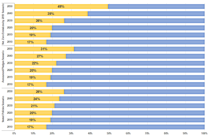 Con specifico riferimento alle FER, la loro quota nella generazione elettrica è stimata crescere dall’attuale 30% ad oltre il 40% nel 2030 nello scenario STEPS (quasi il 60% nel 2050), al 45% nello scenario APS (71% nel 2050) e al 60% nello scenario NZE (88% nel 2050). Secondo le stime del WEO 2021, per procedere verso una effettiva decarbonizzazione della produzione di energia elettrica, si prospettano incrementi ingenti nel solare fotovoltaico e nell’eolico, con un peso nel mix di generazione globale che è atteso passare nei differenti scenari dall’odierno 10% al 40-70entro il 2050, con valori ancora maggiori in alcune regioni.