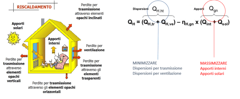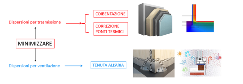 Osservando il bilancio energetico previsto dalla norma UNI TS 11330-1, per migliorare le prestazioni energetiche di un edificio occorre minimizzare le dispersioni e massimizzare gli apporti, soprattutto quelli solari. Per diminuire le dispersioni per trasmissione occorrerà agire sull’isolamento termico degli elementi disperdenti opachi (pareti, solai, coperture...) e trasparenti (finestre) e sulla correzione dei ponti termici, mentre le dispersioni per ventilazione saranno eliminate tramite interventi che migliorino la tenuta all’aria dell’edificio.