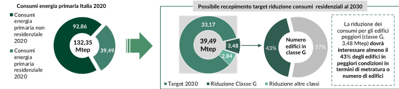 La riduzione dei consumi di energia primaria da edifici in condizioni peggiori inoltre dovrà coinvolgere almeno il 43% del parco edilizio degli edifici in peggiori condizioni, in termini di metrature o numero di abitazioni.