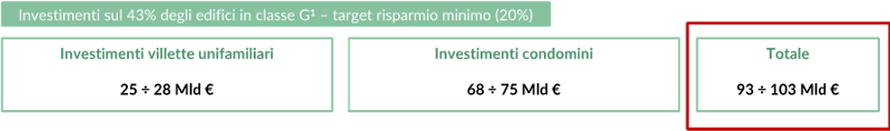 Per intervenire sul 43% degli edifici di classe G nel nostro Paese sarebbero dunque necessari tra i 93 ed i 103 miliardi di €, così distribuiti.