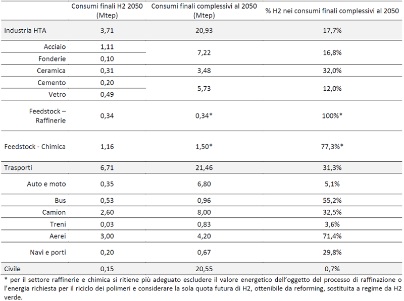 -          Lungo periodo (2040 – 2050). Nel lungo periodo la penetrazione dell’H2 potrà raggiungere circa il 18% dei consumi finali dell’industria HtA e del 30% dei consumi finali nel settore dei trasporti. In quest’ultima fase l’H2 assumerà un ruolo anche in altri contesti come nel bilanciamento delle reti e nello stoccaggio di lungo periodo.