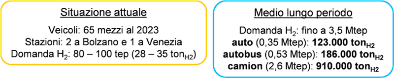 Quanto ai camion, oggi non sono presenti mezzi ad H2 in Italia, domani, invece, l'H2 è considerato una delle soluzioni più percorribili in quanto presenta un comportamento simile ai carburanti classici: rifornimento veloce, elevata autonomia e capacità di carico elevate.