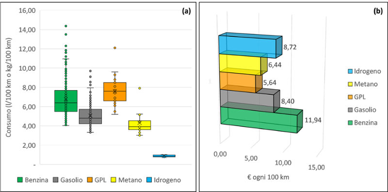 a) Consumo di carburante dei modelli di autovettura venduti in Italia nel 2016. b) Confronto tra il costo di carburante per percorrere 100 km con le diverse alimentazioni. Per l’H2 si è considerato il costo di 10 €/kg mentre per gli altri carburanti il costo medio settimanale (07/04/2025).