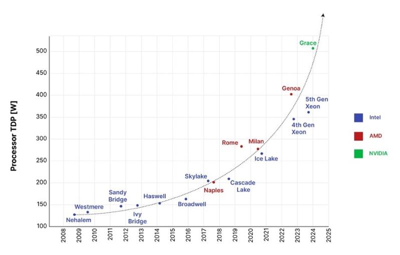 Al fine di garantire le prestazioni necessarie per l’esecuzione di software sempre più esigenti in termini di risorse i produttori di CPU hanno miniaturizzato un numero crescente di transistor portando inevitabilmente ad un aumento del calore da dissipare per ciascun processore (in un grande datacenter si trovano facilmente migliaia di CPU). Il Thermal Design Power (TDP) di una CPU indica la potenza termica da dissipare per il funzionamento e, come si può facilmente vedere, la sua crescita negli ultimi quindici anni è stata più lineare, richiedendo un fattore 5x in più di capacità refrigerante al datacenter per poter assicurare la corretta operatività di questi sistemi. Va anche detto che nei datacenter non vi sono solo processori: per effettuare calcoli ad alte prestazioni sono infatti necessarie anche le cosiddette GPU, processori specializzati per il calcolo vettoriale come quelli prodotti da nVidia e recentemente resi famosi al grande pubblico dall’intelligenza artificiale. Da un punto di vista della dissipazione termica, poi, la necessità di concentrare sempre più transistor in poco spazio si è acuita significativamente negli ultimi 10 anni.