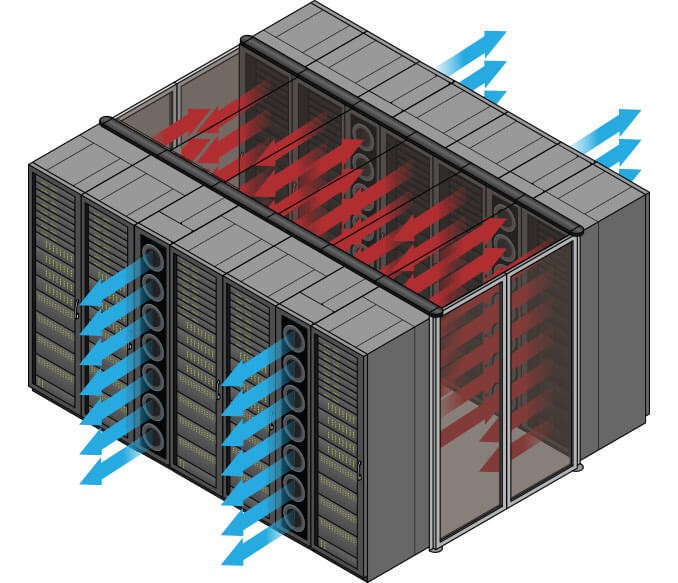Per far fronte alla sempre maggior richiesta di potenza per rack si è introdotta una differente architettura negli ultimi quindici anni, basata su in-row coolers: gli apparati refrigeranti, ora esterni al datacenter, raffreddano in un circuito chiuso l’acqua che viene inviata a colonne di ventilazione (in-row coolers) che, utilizzando file di ventilatori, forzano il passaggio attraverso un radiatore emettendo aria fredda che poi gli apparati utilizzeranno per raffreddare. L’aria calda, spesso confinata in un corridoio, viene quindi resa disponibile per il nuovo raffreddamento in ingresso come mostrato in figura.
