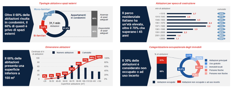 Quanto al parco edilizio italiano, lo studio evidenzia come quello italiano sia tra i più datati in Europa: oltre il 70% delle abitazioni ha più di 45 anni. A questo si aggiunge l’alta incidenza di condomini senza spazi esterni (oltre il 60%) e unità abitative di piccole dimensioni (60% sotto i 100 m²). Non è trascurabile nemmeno la quota di abitazioni non occupate o ad uso incerto, che rappresenta circa il 30% del totale.