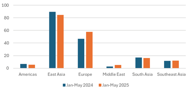 Europe has taken a greater share of the LNG market this year as it raised its prices to divert cargoes away from Asia to ensure steady injections into gas storage facilities after a colder winter.  Europe, including the UK and Turkey, took in 32% of global LNG imports during January-May 2025, up five points from January-May 2024, when the region received 27% of deliveries. In absolute terms, Europe took in an extra 11 million tonnes, reaching a total of 57.7 million tonnes. In January 2025 ICIS LNG Edge ship-tracking recorded seven ships that were heading from the US to Asia making dramatic course-changes in the mid-Atlantic to head back to Europe instead. This was an unusually high number.