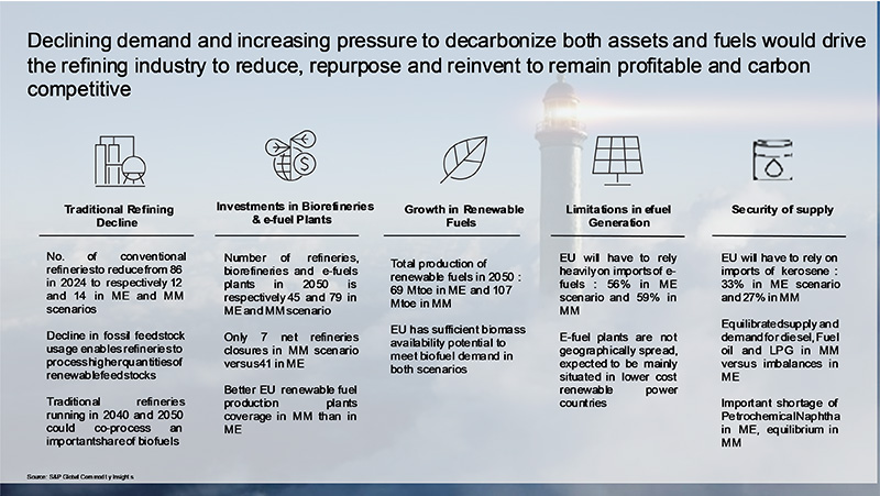 E qui entra in campo uno studio preparato da S&P per Concawe e presentato nel marzo 2025: “Study on the potential evolution of Refining and Liquid Fuels production in Europe”.