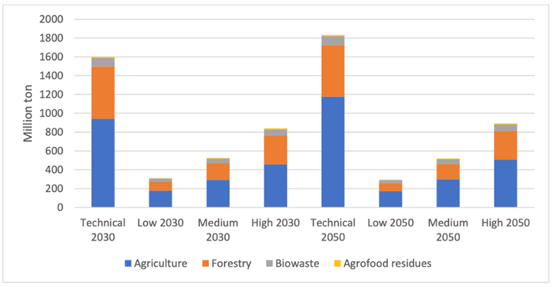 Lo studio ha anche esaminato la disponibilità di biomassa. In funzione del livello di “mobilizzazione” (capacità di recuperarla a costi accettabili), questa è risultata compresa in un range pari a 310-836 mil. di ton al 2030, e 294 - 892 mil. di ton. al 2050 (a fronte di un potenziale tecnico superiore a 1600 e 1800 mil. di ton al 2030 e 2050, rispettivamente). La maggior parte di questo potenziale risiede nel settore agricolo, con a seguire il forestale e quindi, in misura significativamente inferiore, i biowaste. Il quantitativo stimato al 2050 si prevede includerà anche un contributo significativo dai terreni marginali, dalle rotazioni colturali, e dalle biomasse lignocellulosiche, grazie allo sviluppo industriale di queste tecnologie.