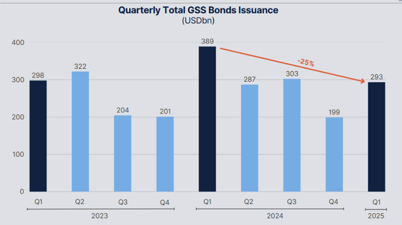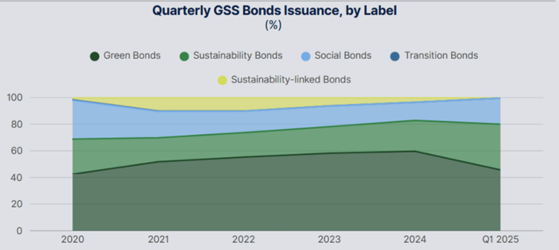 Nonostante continuino a essere l’etichetta più utilizzata dagli emittenti, i green bond stanno lentamente perdendo terreno all’interno del mercato complessivo delle obbligazioni sostenibili. Nel primo trimestre del 2025, questi strumenti hanno rappresentato circa il 45% del volume totale emesso, confermandosi comunque come la categoria dominante. Tuttavia, si registra un calo significativo rispetto al 2024, quando costituivano circa il 57% del totale delle emissioni GSS. Questo ridimensionamento, pur non intaccando il loro ruolo centrale, segnala una graduale diversificazione del mercato, con una crescente attenzione verso altri tipi di strumenti ESG.
