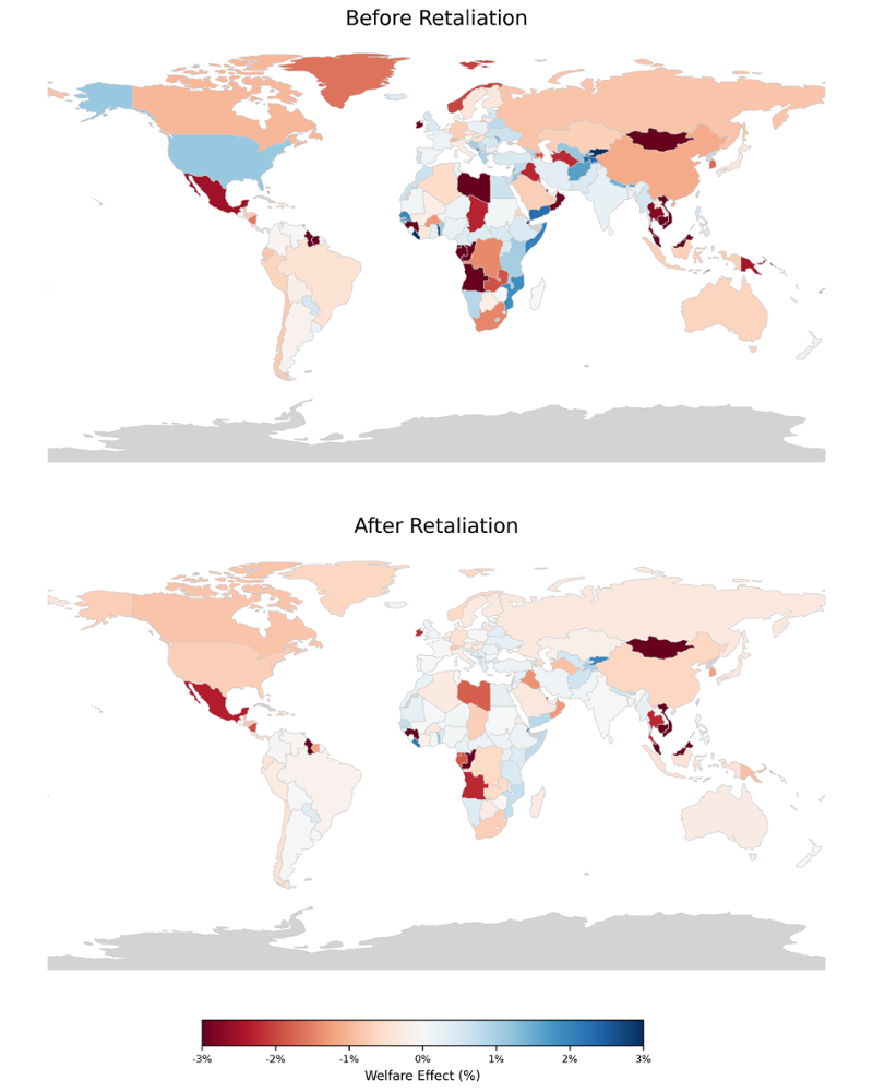 Effetti dei dazi statunitensi sul benessere senza ritorsioni (in alto) e con ritorsioni (in basso)
