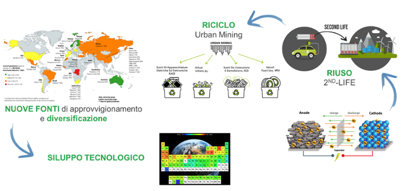 Fonte: rielaborazione RSE da fonti: RMIS – Raw Materials Information System, ESO/N. Bartmann/ESA/Hubble, Handbook of Battery Materials, CIC Energigune - Second life batteries for a sustainable energy transition, Roma La Sapienza