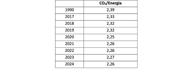 Come si può vedere, il coefficiente è sostanzialmente bloccato. Paradossalmente, nel 2020 era più basso che nel 2024. In senso stretto, non c’è decarbonizzazione perché essa consiste proprio nella riduzione di questo numero, che idealmente dovrebbe tendere a zero. Ma quel che vediamo è che ciò non accade: il coefficiente è sostanzialmente stabile, ed è chiaro che non è possibile alcuna transizione se non si riduce l'intensità carbonica dell'energia e se i decrementi, quando avvengono, impattano sulla seconda cifra decimale. Certo, possiamo ridurre le emissioni consumando meno energia ed essendo più efficienti, e negli ultimi decenni gli incrementi di efficienza hanno contribuito al contenimento delle emissioni più di quanto abbia fatto la modifica del mix energetico. Ma ciò è solo un pezzo, meno importante, della decarbonizzazione la cui essenza, in ultimo, risiede proprio nel tendere all’azzeramento dell'intensità carbonica dell'energia, tagliando alla radice il link tra consumi di energia e CO2.