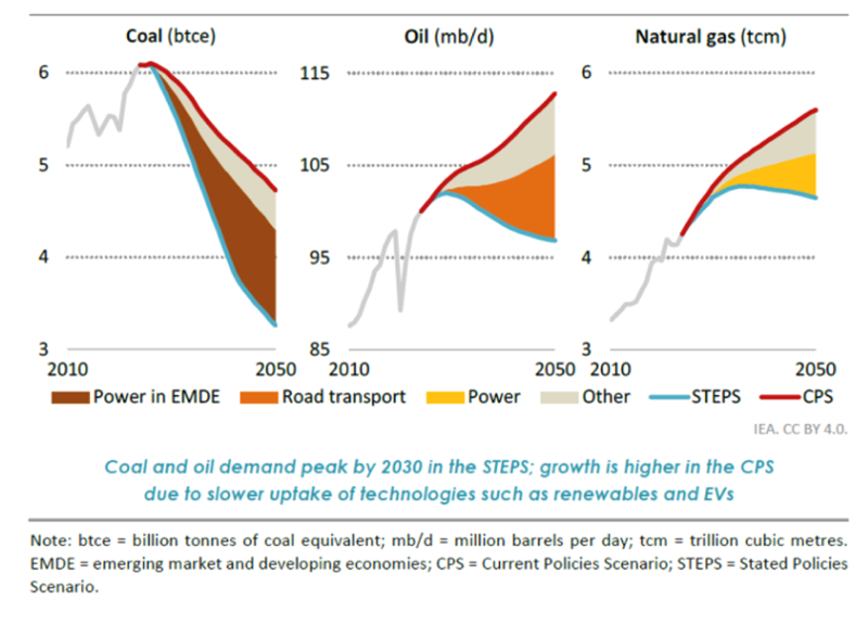 Il primo si riferisce alla distanza tra lo scenario STEPS (Stated Policies) e quello CPS, mostrato in modo assai efficace dalla IEA nel grafico seguente. Mentre nel caso del carbone assistiamo alla riduzione dei consumi sia nello scenario CPS che, in misura più marcata, in quello STEPS, nel caso di petrolio e gas naturale siamo di fronte a curve che prendono direzioni opposte, crescenti (CPS) oppure decrescenti (STEPS). Per il petrolio, nel 2035 la domanda totale è ipotizzata essere di 5 milioni di barili al giorno (mil. bbl/g) superiore nel CPS rispetto allo STEPS, con il 40% di questa differenza dovuta alla lentezza della penetrazione delle auto elettriche. Nel caso del gas, il delta nei consumi tra i due scenari è intorno al 6% ed è dovuto essenzialmente alla diversa velocità di penetrazione delle rinnovabili nella generazione elettrica.