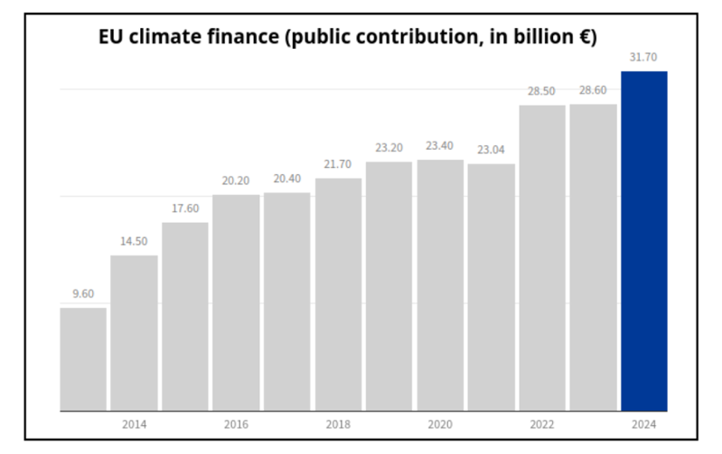 Secondo quanto comunicato da Bruxelles, i 31,7 miliardi di euro di finanziamenti per il clima provenienti da risorse pubbliche rappresentano il contributo complessivo dell’Unione Europea e degli Stati membri a favore dei Paesi in via di sviluppo nel corso del 2024.