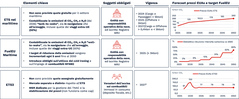 Il sistema ETS, oggi giunto alla sua quarta fase di sviluppo, impone già l’acquisto di quote di CO₂ ai settori energivori. Dal 2024 anche il settore marittimo è incluso nel meccanismo ETS, obbligando le navi cargo e passeggeri sopra le 5.000 GT a contabilizzare le emissioni sia in navigazione sia all’ormeggio, incluse le tratte extra-UE (nelle quali viene considerato il 50% delle emissioni). Ad oggi il prezzo delle quote ETS è di circa 75-80 €/ton CO₂, ma gli scenari indicano come potrebbe toccare i 135 €/ton CO₂ entro il 2030 e 200 €/ton CO₂ nel 2050.