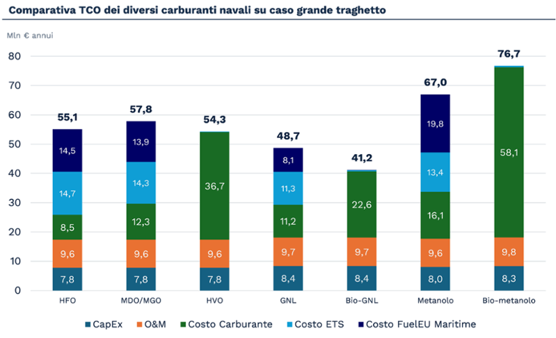 Nel settore marittimo, il meccanismo ETS può incrementare il TCO fino al 50% per i combustibili fossili tradizionali (HFO, MDO e MGO). Considerando anche l’impatto del regolamento FuelEU Maritime, i valori di TCO annuali potrebbero addirittura raddoppiare. In questo scenario, il Bio-GNL, seguito dal GNL, si dimostra altamente competitivo, e tutte le molecole biogeniche diventano alternative economicamente vantaggiose rispetto ai combustibili fossili proprio grazie all’effetto combinato di ETS e FuelEU Maritime.
