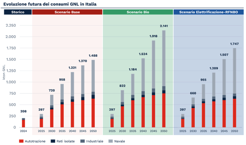 Gli scenari di lungo termine delineano una crescita significativa del mercato del GNL in Italia. La domanda attuale, stimata attorno a 200 mila tonnellate l’anno, potrebbe triplicare entro il 2030 e superare i due milioni di tonnellate nel 2050. Il principale motore di questa espansione è il comparto navale, che potrebbe superare 1,2 milioni di tonnellate annue, anche in virtù della limitata disponibilità di alternative tecnologiche realmente mature per la decarbonizzazione delle grandi flotte. Un contributo rilevante proverrebbe inoltre dal trasporto stradale pesante, che potrebbe oltrepassare le 750 mila tonnellate annue entro la metà del secolo.