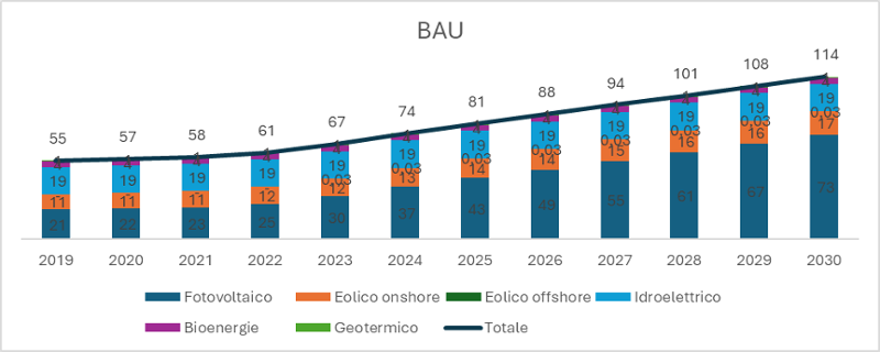 - scenario Business As Usual (BAU), in cui le installazioni prospettiche FER sono state quantificate sulla base dell’andamento storico;