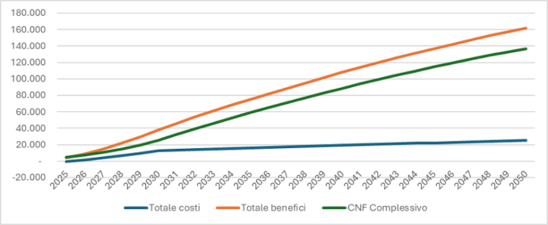 Andamento dei costi e dei benefici totali 2025-2050, PNIEC 2024 vs BAU (milioni di €)