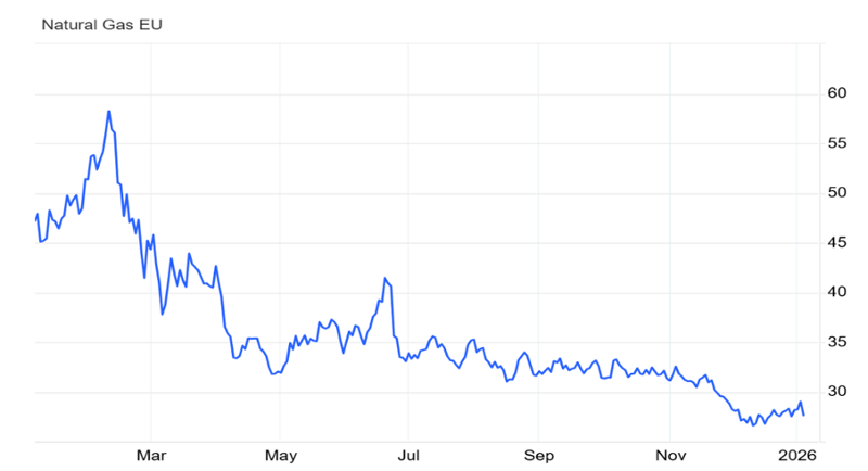Prezzo TTF del Gas Naturale nel 2025 (€/MWh)