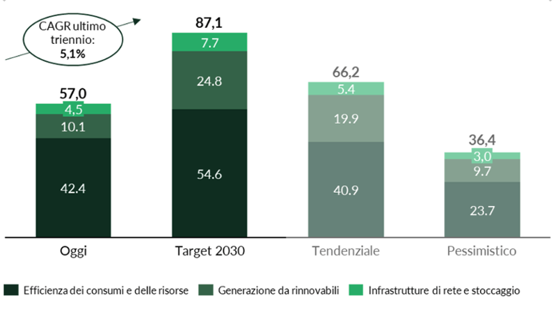 Accanto all’efficienza, la generazione da fonti rinnovabili e la produzione di vettori energetici puliti rappresentano un altro pilastro della crescita. Il mercato vale oggi oltre 10 miliardi di euro, trainato da fotovoltaico ed eolico, ma con un potenziale crescente legato al biometano e alla filiera dell’idrogeno verde. Anche in questo caso, non va considerato solo il valore delle tecnologie, ma anche quello dell’energia prodotta: già oggi all’energia generata da fotovoltaico, eolico e biometano è associabile un valore economico pari a 6,7 miliardi di euro.