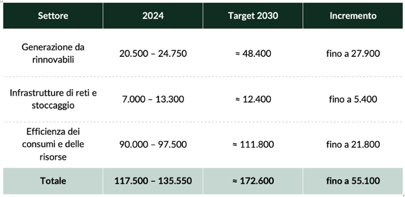 Se l’impatto economico è già evidente, quello occupazionale è forse ancora più strategico. Le filiere Cleantech impiegano oggi circa 130 mila addetti diretti in Italia e potrebbero arrivare a 173 mila entro il 2030, con una crescita del 33%. È occupazione qualificata che si sviluppa lungo tutta la catena del valore: ingegneria, produzione, assemblaggio, installazione, gestione e manutenzione degli impianti. Il settore delle rinnovabili, in particolare, è destinato a fornire il contributo maggiore in termini di nuovi posti di lavoro: fino a 28.000 nuovi occupati in 5 anni. E questi numeri non includono l’intero indotto, che amplierebbe ulteriormente il potenziale occupazionale.